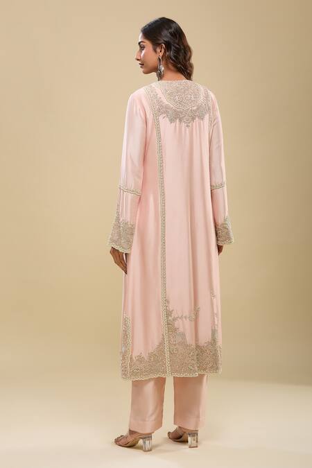 Pink kurta featuring intricate embroidery with a round neckline and bell sleeves. Paired with matching pants and a coordinating dupatta.