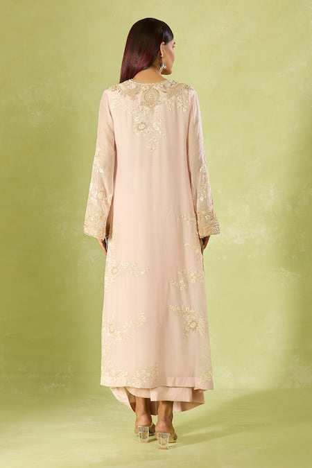 Pink kurta featuring intricate embroidery and bell sleeves. Paired with a matching draped skirt.