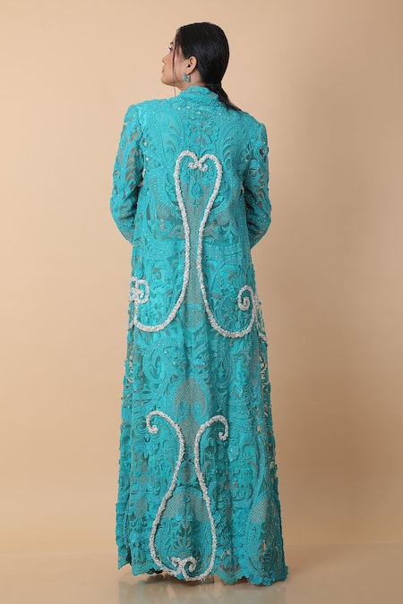 Buy_Anamika Khanna_Blue Silk Pearls, Embroidery Round Neck, Fleur Long Coat And Draped Skirt Set_at_Aza_Fashions