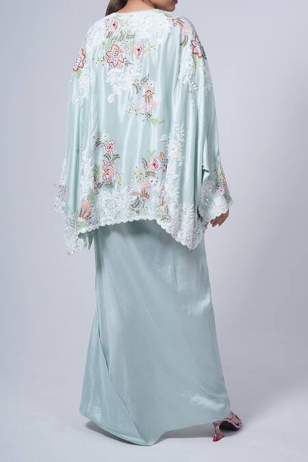 Blue floral embroidered boxy top featuring batwing sleeves and a V neckline. Paired with a solid draped skirt for a cohesive look.