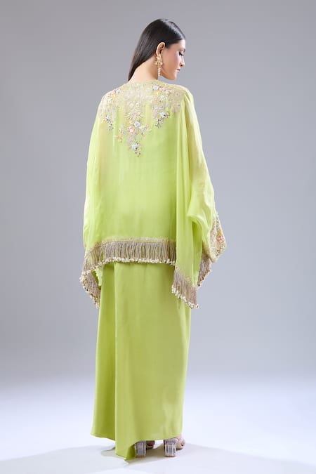 Lime green cape featuring multi-color floral embroidery with tassel detailed hem. Paired with an inner slip and a draped skirt.