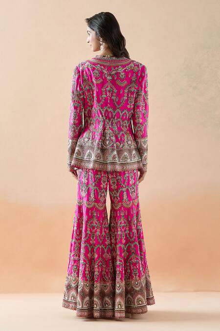 Pink peplum jacket featuring floral hand embroidery and a notched neckline. Paired with a coordinating sharara with intricate embroidery details.