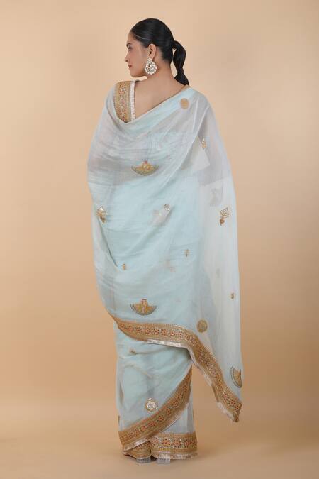 Blue saree featuring floral and peacock embroidery with a fringed border. Comes with a coordinating unstitched blouse piece.