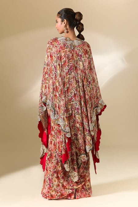 Red floral print cape featuring multi-colored prints and embroidered borders. Paired with a matching printed blouse, sharara, tie-up drape, and embroidered belt.
