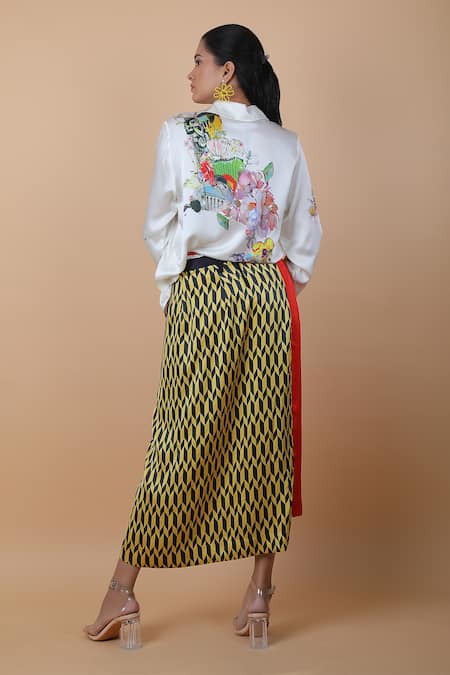 White Silk Embroidery Collared Floral Print Shirt And Skirt Set