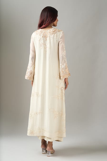 Ivory kurta featuring intricate embroidery and bell sleeves. Paired with a matching skirt with pleated detailing.