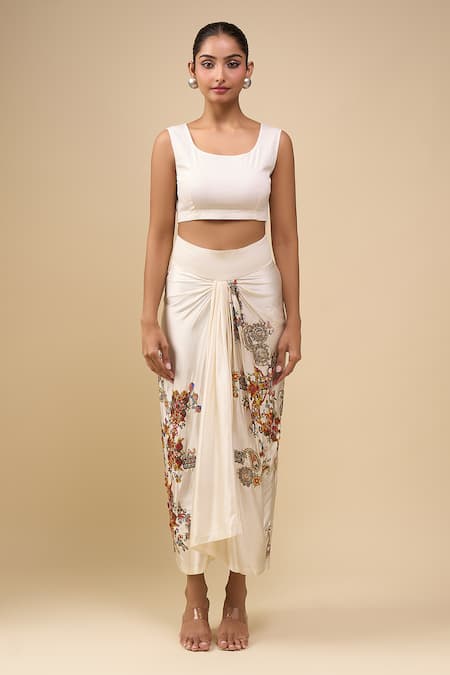 Ivory embroidered skirt set featuring a cape, top, and skirt. The skirt has intricate floral embroidery and drapes elegantly.