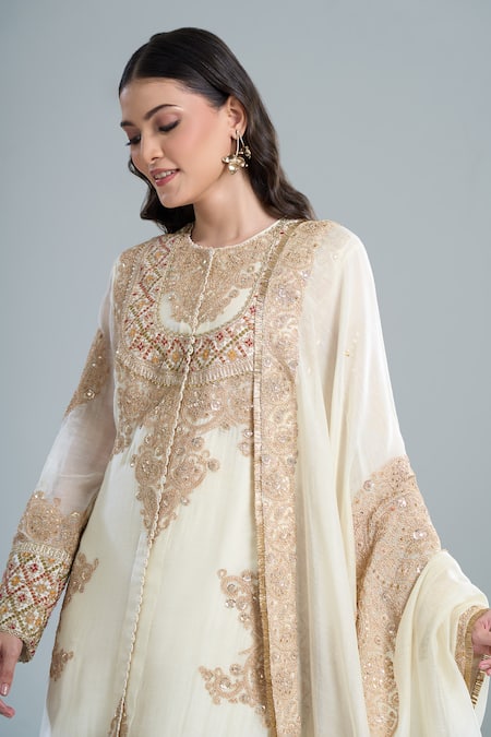 Ivory embroidered straight kurta set featuring intricate embellishments. Includes a churidar and a dupatta for a complete look. Comes with an inner.