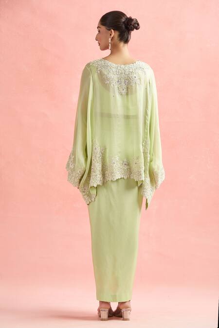 Mint sheer tunic featuring floral, zardozi, and thread embroidery. Paired with an inner blouse and draped skirt.