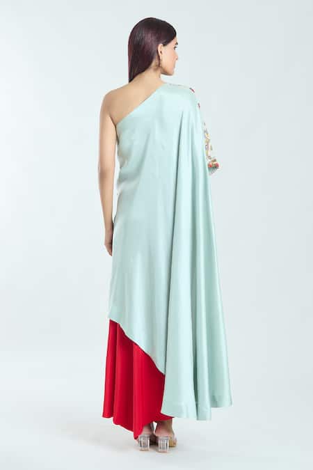 Blue one shoulder tunic featuring geometric beaded embellishments. Paired with a contrasting red draped skirt with a side zip closure.