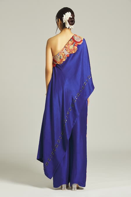 Indigo blue one shoulder top featuring tribal pattern overlap panel with multi-color applique, thread, bead, and sequin embroidery. Paired with straight pant adorned with side embroidered panels.