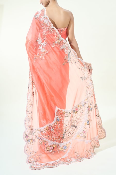 Coral saree featuring floral, pearl, and zardozi embroidery with broad scalloped borders. Includes a matching unstitched blouse piece for customization.