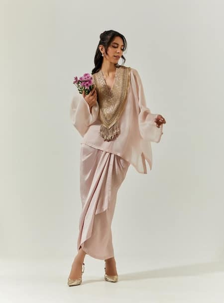 Powder pink organza hand embroidered cape featuring intricate detailing. Paired with a pickup skirt that complements the cape's elegance.
