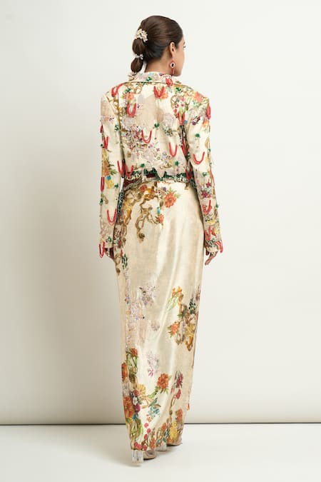 Beige short cropped jacket featuring multi-colored floral prints and beaded tassel embellishments. Paired with a coordinating draped skirt adorned with intricate detailing.