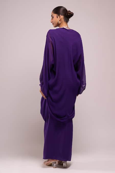 Purple draped skirt paired with a matching top and an embroidered jacket. The jacket features floral embroidery and a flowing design.