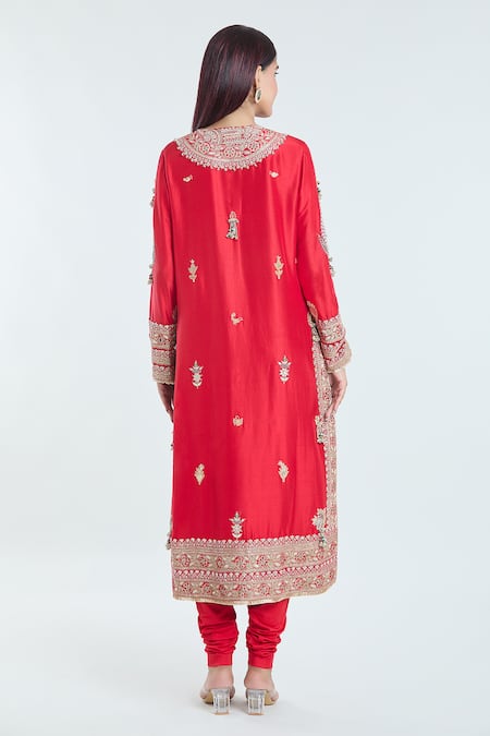 Red straight kurta featuring intricate sequins, dori, beads, and tassel embroidery. Paired with a paisley embroidered dupatta and churidar.