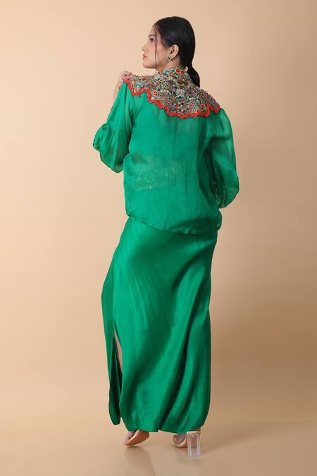 Green Silk Sequins, Beads Tasseled Embellished Cape And Draped Skirt Set