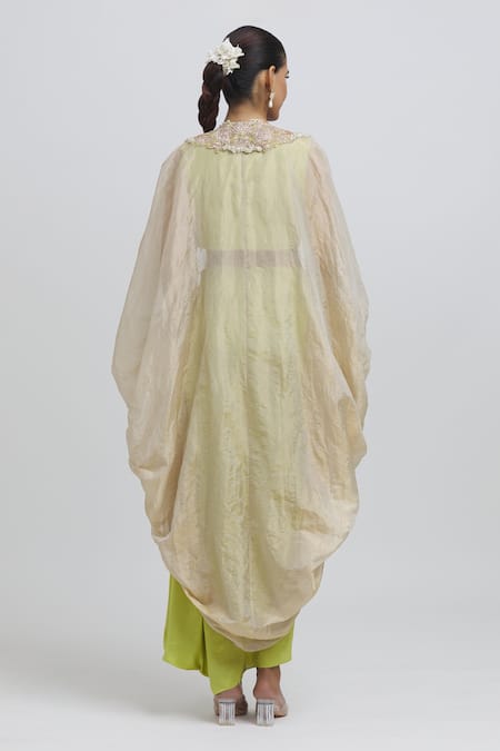 Green top featuring overlap cut work panel and floral pattern with metallic zardozi, sequin & bead embroidery. Paired with a pleated cowl draped skirt and an embroidered bordered cape.