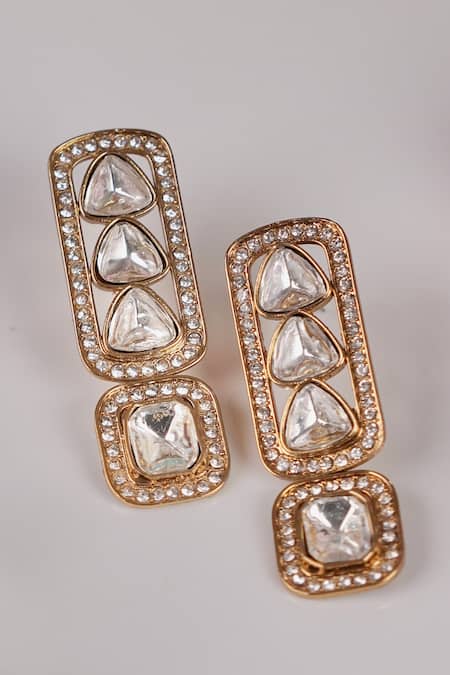 Antique gold polish geometric earrings featuring clear kundan and polki embellishments