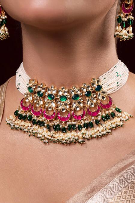 Buy_Anana_Multi Color Pearls, Gota Patti, Arzoo Moissanite Polki Embellished Choker Set_at_Aza_Fashions