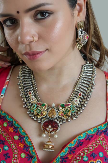 Multi-color necklace featuring silver and gold cow & peacock carved pendant with semi-precious stone embellishments. Paired with matching earrings that have a push back clasp.