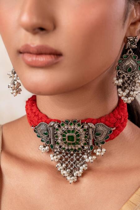 Red and green choker necklace featuring a silver base with intricate embellishments. Paired with matching earrings adorned with similar designs and pearl accents.
