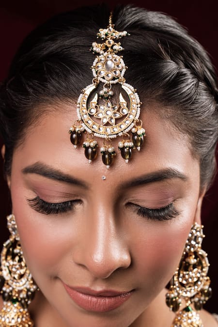 Green Pearls, Metallic Ishita Half Crescent Carved Maangtikka And Earrings Set