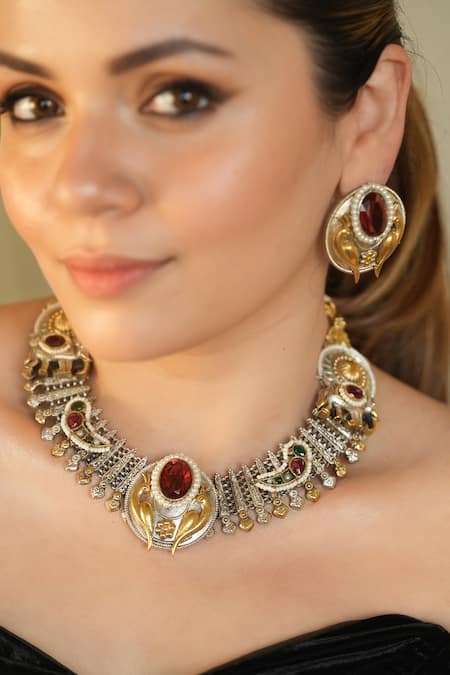 Silver/gold antique finish on the choker, Kundan polki embellishments on earrings and necklace
