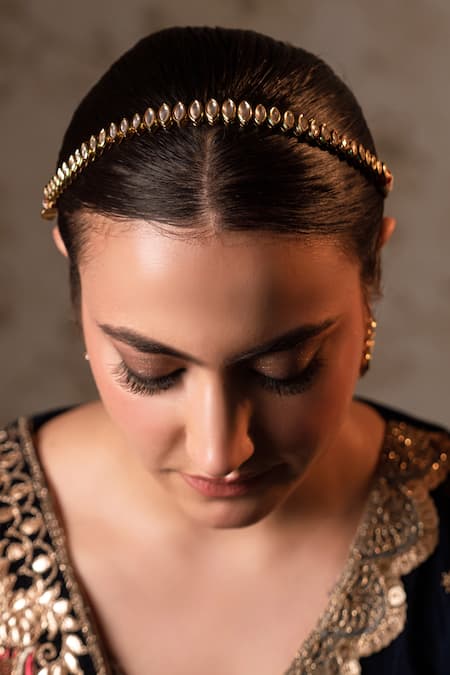 Green beads and polki highlights adorn the 22kt gold plated choker. Includes a pair of matching earrings with push back clasp.