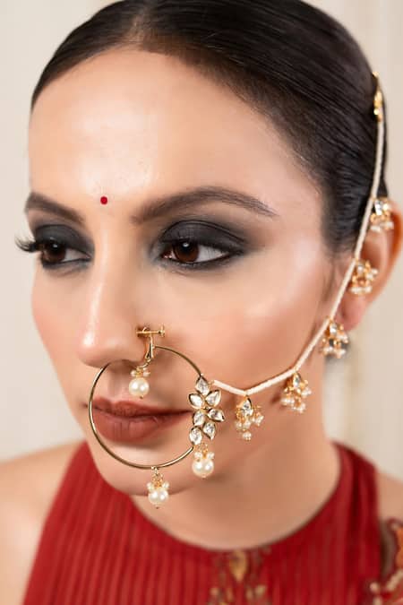 Gold plated nosepin featuring polki, kundan, and white bead embellishments