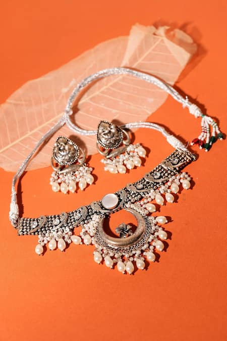 Silver antique finish crescent carved pendant necklace featuring crafted white pearls and ghungroos. Paired with matching dangler earrings adorned with similar pearl detailing.