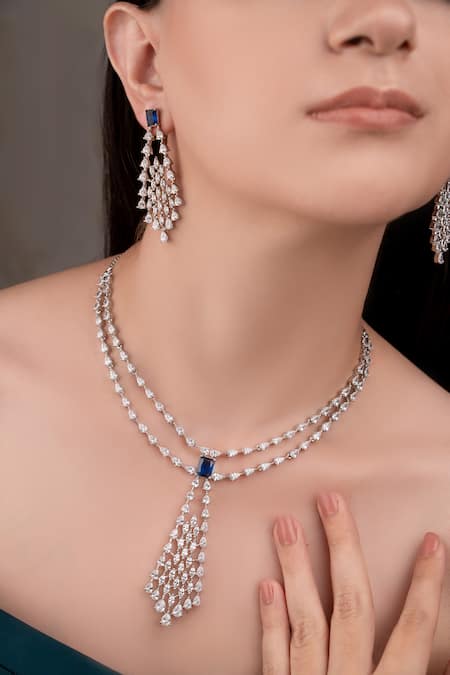 Royal blue designer necklace featuring multiple strands and a central drop. Paired with matching earrings adorned with cascading embellishments.