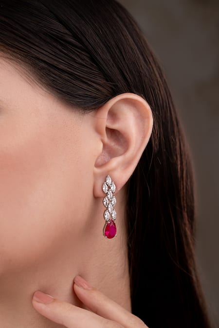 Teardrop ruby red stones in earrings, Intricate silver plating detailing, Choker features a unique design with alternating stones