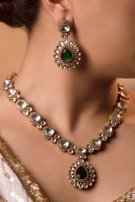 Green necklace featuring intricate kundan, polki, and moissanite embellishments. Paired with matching dangler earrings that complement the necklace's design.