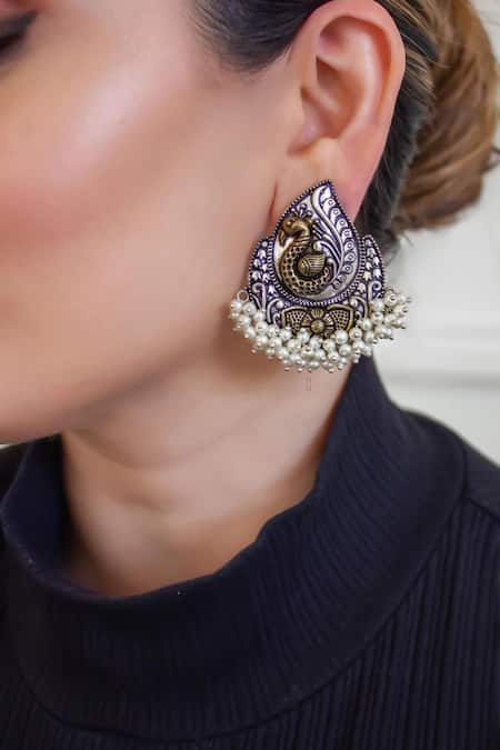 Peacock carved detailing, White beaded clusters, Metal alloy composition
