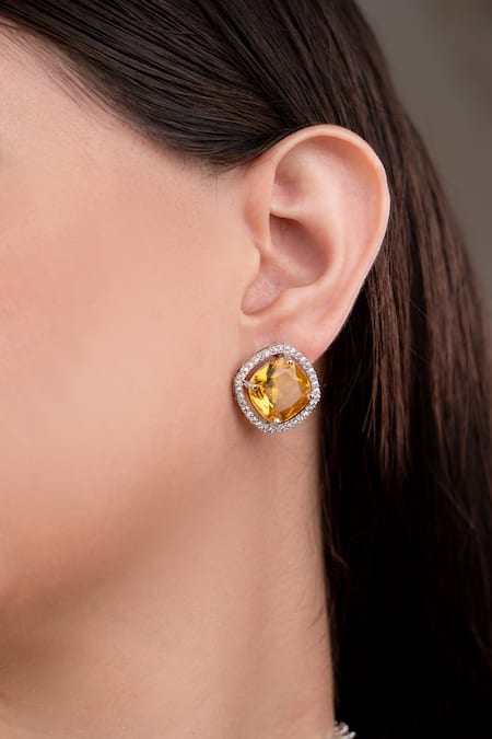 Yellow choker necklace featuring a hook closure and adorned with a central stone. Paired with a matching pair of earrings that have a push back closure.