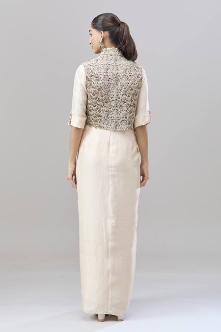 Beige shirt dress featuring a spread collared neckline and three-quarter sleeves. Paired with a floral cutwork embroidered cropped jacket.
