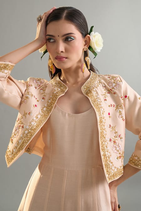 Beige silk chanderi anarkali featuring a spaghetti style design. Paired with an old rose embroidered jacket adorned with floral motifs and intricate embellishments of sequins, zari, pearls, cutdana, and resham.