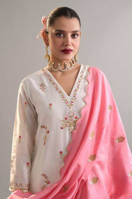 Off White silk chanderi kurta featuring V neck with floral embroidery. Paired with matching pant embellished with floral motifs in resham, sequins, zari, and cutdana.