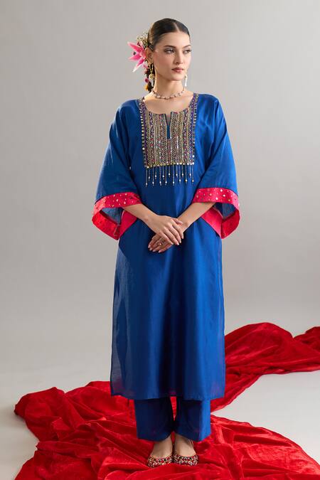 Royal blue kaftan featuring intricate embroidery with sequins, zari, pearls, cutdana, and resham. Paired with a matching pant, this set offers a relaxed fit and elegant style.