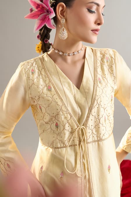 Light yellow silk chanderi kurta set featuring gota work and floral motifs. Paired with an angarkha jacket and matching pant with intricate embroidery details.