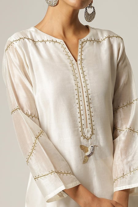 Off-white kurta featuring placement bird motif pearl work and zari embroidered sleeves. Paired with zari embroidered pant for a complete look.