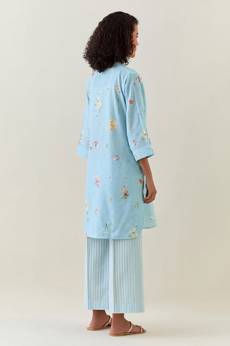 Buy_Anantaa By Roohi_Blue Cotton Embroidery Split V-neck Printed Linen Kurta And Pant Set _at_Aza_Fashions