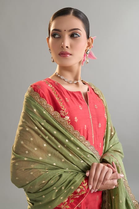 Red zari motifs silk chanderi embroidered yoke kurta featuring delicate floral thread embroidery accentuated with sequins and cutdana. Paired with contrast lime green semi elasticated embroidered pant.