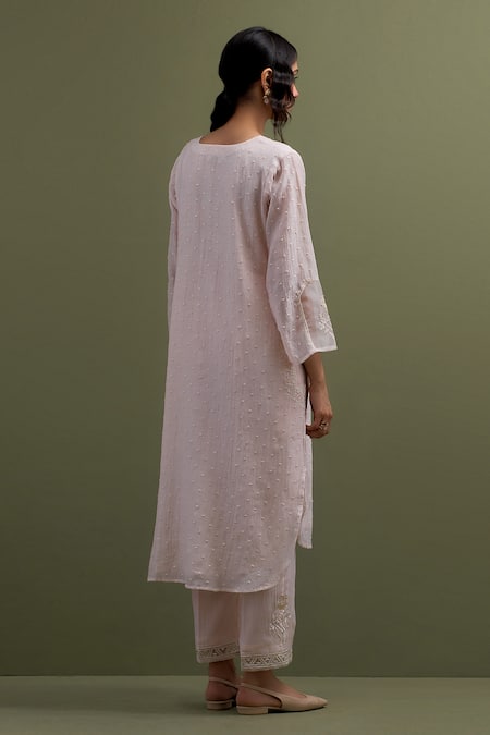 Pink kurta featuring notched neckline, three-quarter sleeves, and high low hem. Paired with embroidered hem pant, both crafted from mul chanderi fabric.
