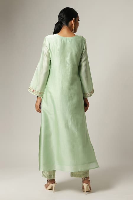 Green Silk, Chanderi Embroidery Split V-neck Kurta Pant Set