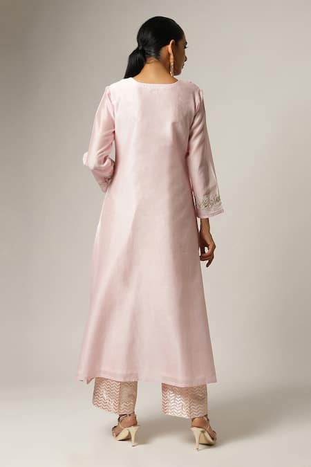 Pink Silk, Chanderi Embroidery Split V-neck Kurta Set