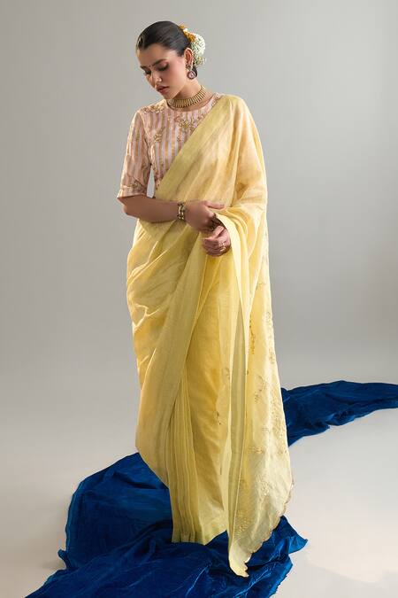 Yellow embroidered saree featuring sequins, zari, crystals, cutdana, and resham. Paired with a pink blouse with floral motifs and a keyhole back.