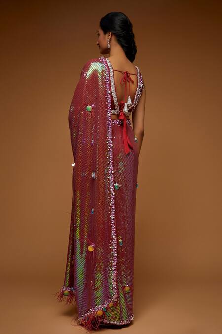 Berry saree in a georgette base with sequin work, embellished with 3D sequin flower and pearls and feathers on the border. Comes with padded V neck blouse.