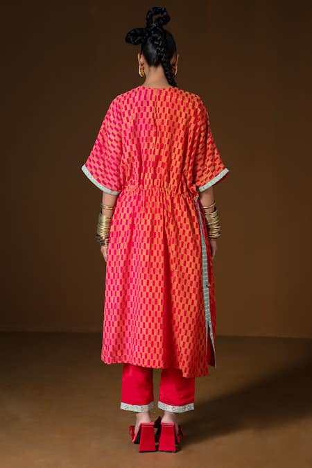Fuchsia Silk Embroidery, Sequins, Mirrors Geometric Printed Kaftan And Pant Set